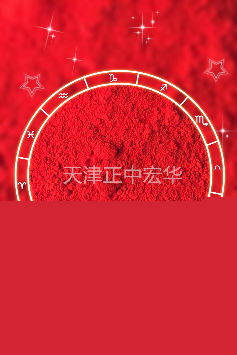 天津市正中宏華化工有限公司(原天津染化六廠)生產顏料,有機顏料,無機顏料,氧化鐵顏料,產品主要有1601顏料綠,大紅粉,聯苯胺黃,甲苯胺紅,酞青綠,酞青蘭,金光紅,耐曬大紅,艷紅6B,寶紅7B,橡膠大紅,氧化鐵紅,氧化鐵黃,氧化鐵綠,中鉻黃,檸檬黃,氧化鐵蘭,耐曬黃G,耐曬黃10G,永固黃G,酞青蘭B,油溶紅,油溶黃,深鉻黃,紅黃藍綠色母,粉筆色漿,產品主要用于塑料,油漆,涂料,文教,印油,水泥,色漿,水磨石,建材,耐磨地坪,電纜,塑膠跑道,油墨,吹膜,農藥,染紙,建筑外墻等很多行業。歡迎新老朋友惠顧!...